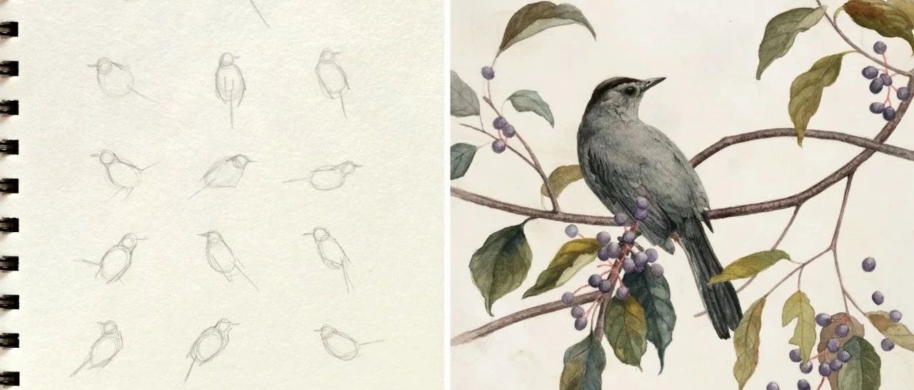 利用你的观察时间来巩固鸟的细节,而不是试图在一个地方完成它。沃尼克说,基本的姿势和颜色很重要,速写草图也很重要,能捕捉到目标鸟的个性。她指出:“依靠记忆比看到一点画一点要容易得多。”。如果鸟在中途消失了,可以画一画周围的植物和环境。